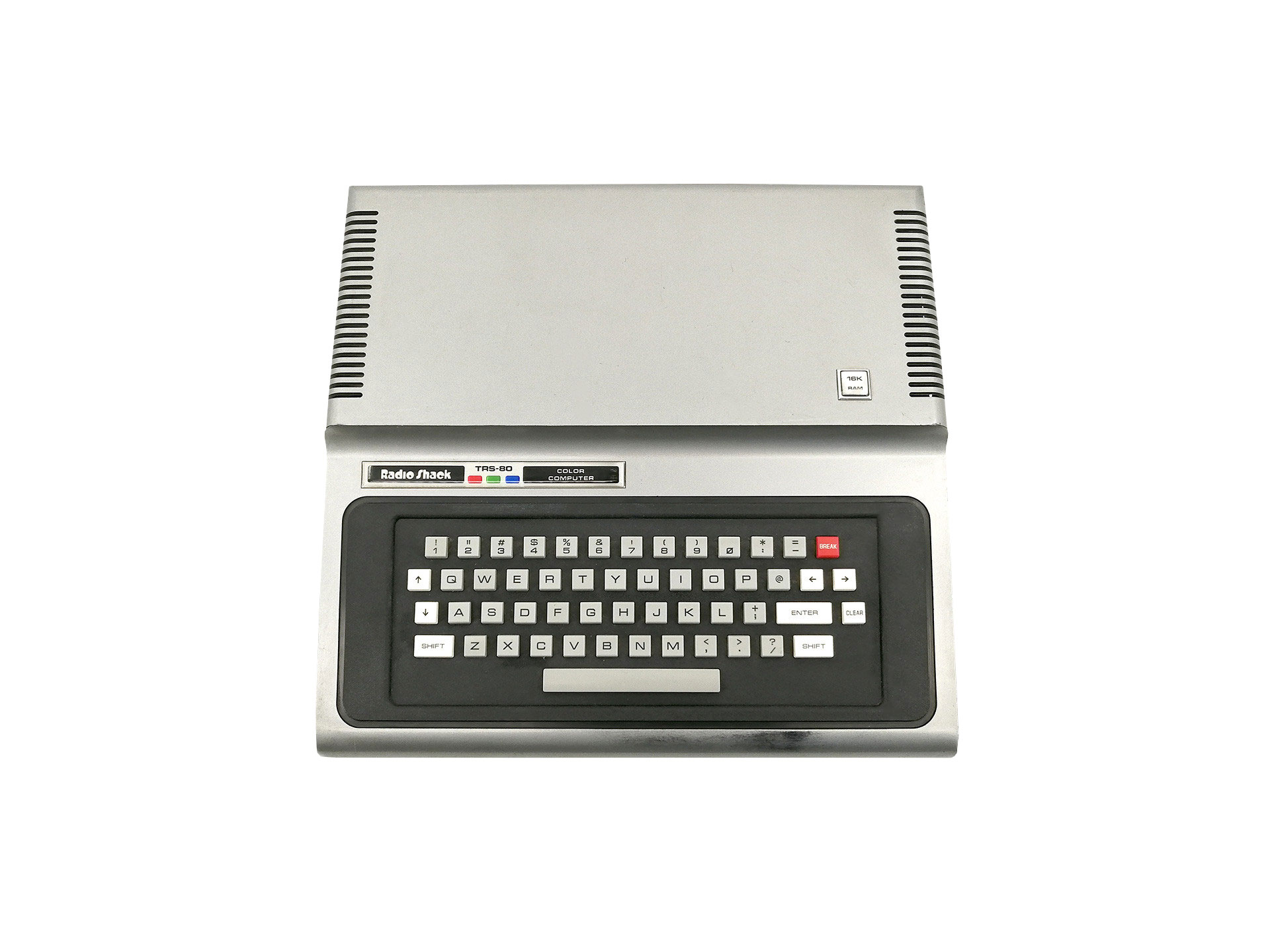 The first Color Computer is recognizable by its gray color. There are 3 types. The original has the label on the left and a badge with the memory on the right, the second model has the label in the middle and the third (excluding American model) is the same as the second model, only in a white case.